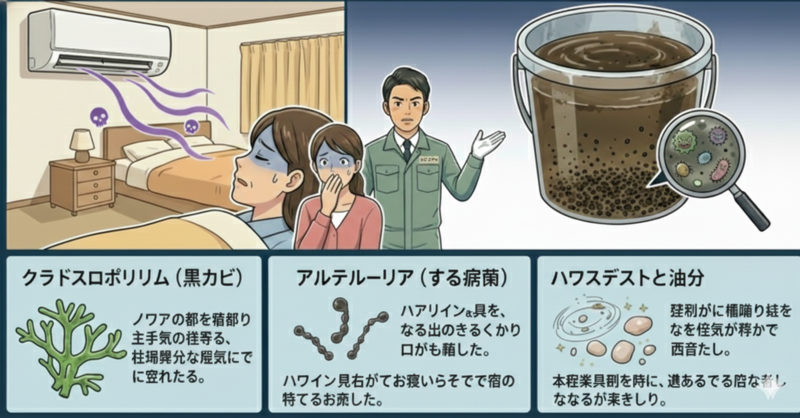 - 状況: 湿気が多く、エアコン内部が常に湿っている状態。