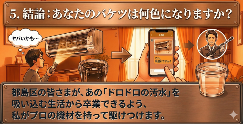 こんにちは。都島区専門のエアコン洗浄プロです。 日々、都島区内のご家庭(特にベルパークシティやセントプレイスなど)を回っていると、洗浄後にバケツに溜まった「水」を見て、お客様が絶句される場面に何度も立ち会います。