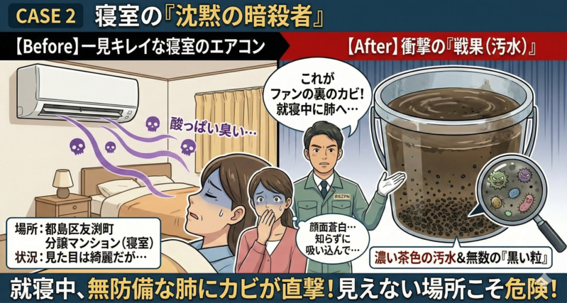 - 結果: 水の色は濃い茶色。さらに、細かい「黒い粒」が無数に。これはファンの裏側にびっしり生えたカビが剥がれ落ちたものです。就寝中、無防備な肺にこれが送り込まれていた事実に、お客様は顔を青くされていました。