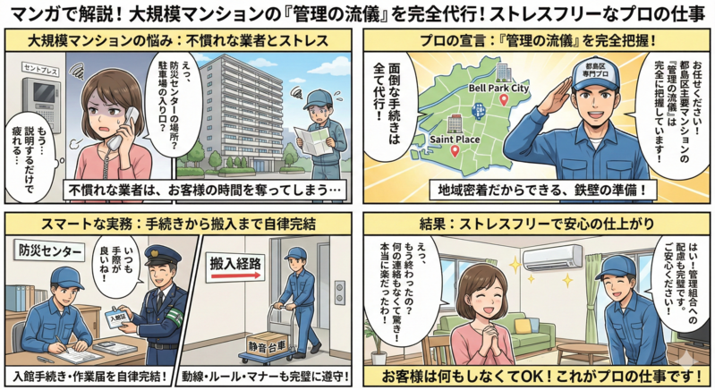 大規模マンションには、一軒家や小規模賃貸とは異なる「作法」があります。私はこれまでの数多くの施工実績から、以下のプロセスをお客様の説明なしで完結させます。