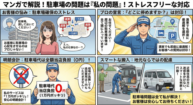 - 「駐車場代は全額当店負担」。お客様に「どこに停めますか?」と聞くことはありません。万が一、来客用駐車場が満車でも、私が最適な場所を探します。